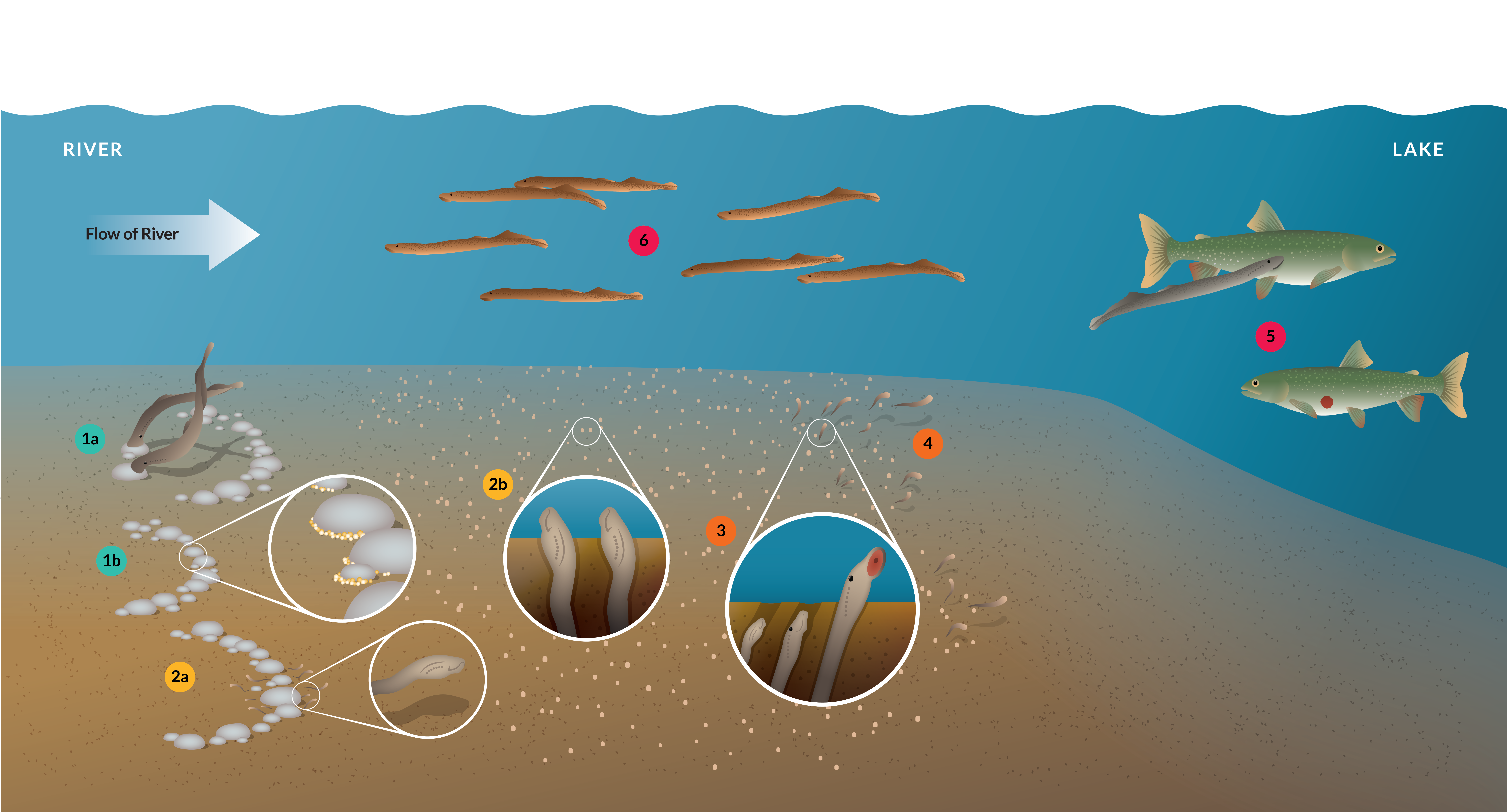 This infographic illustrates the life cycle of the sea lamprey; from larval stage, to parasitic form, to spawning. Illustrations were done by me.