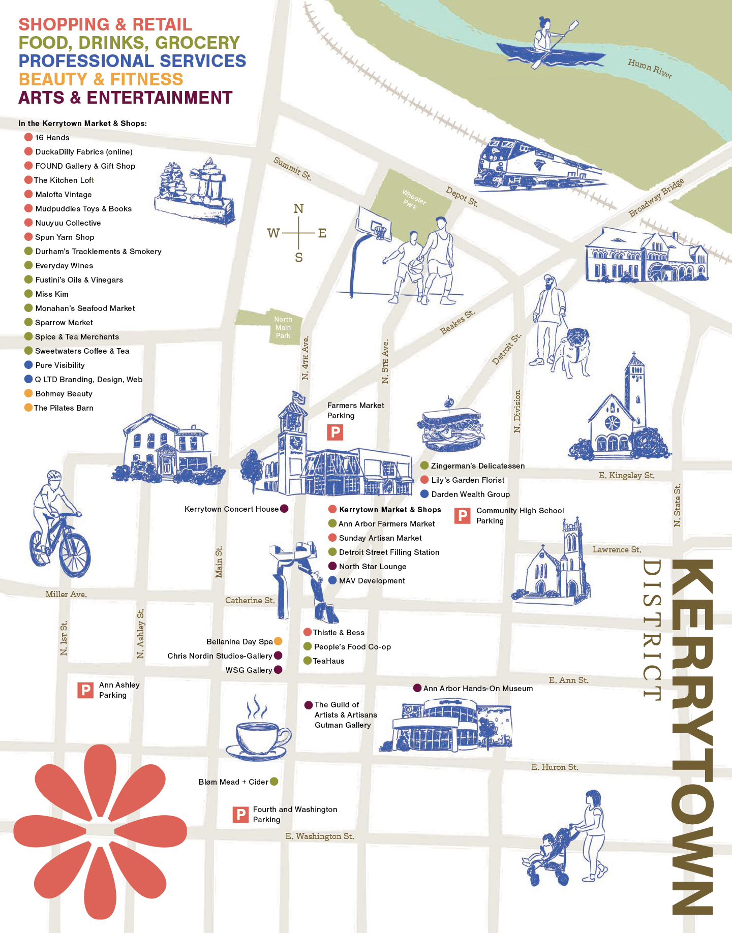 The Kerrytown District of Ann Arbor is an historic neighborhood of residences and locally-owned businesses. In the early days of Ann Arbor, suppliers and manufacturers established themselves in what is now known as the Kerrytown District between the town center and the railroad line. They provided the lumber, coal, our, oil, ice, and supplies needed to develop and maintain a prosperous community. Nearby were the homes of workers, and the adjacent area became a neighborhood of evolving ethnic diversity.