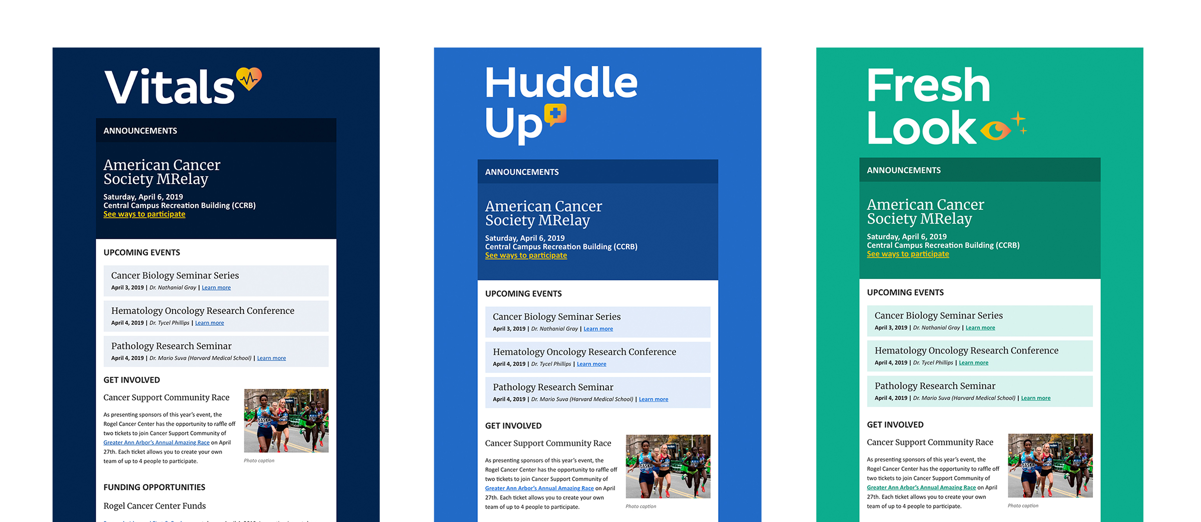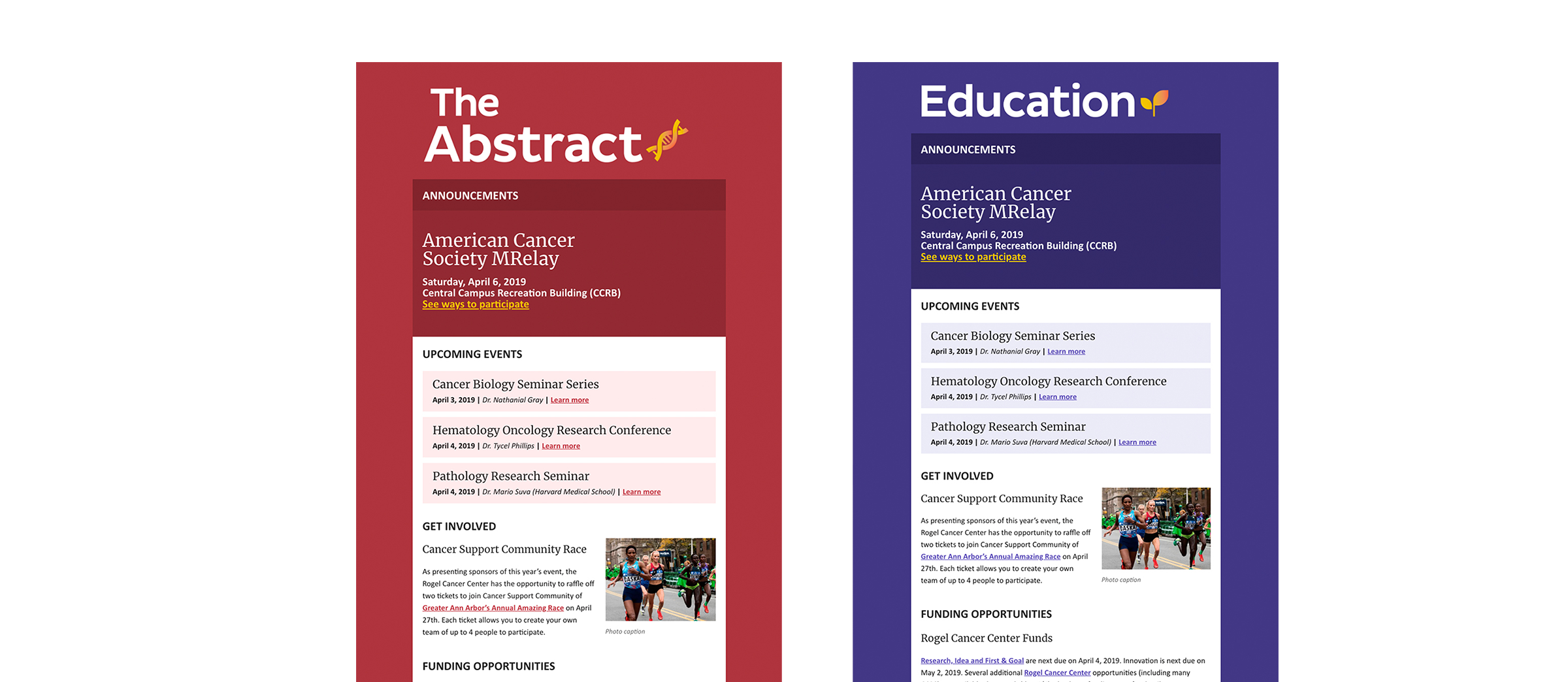 I designed five logo marks for the UM Rogel Cancer Center internal email newsletters. Each mark has its own custom icon and theme color, while also maintaining typographic style to keep all of the marks consistent.